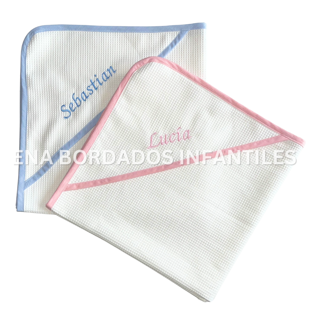 Toalla waffle con nombre bordado en capucha