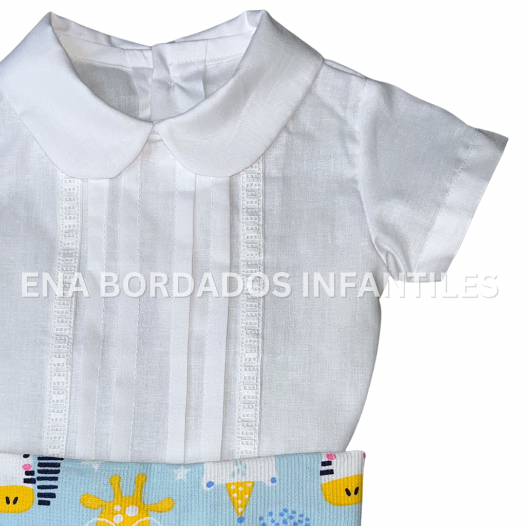 Trajecito camisa alforzas y tira bordada con short piqué animalitos 3 meses